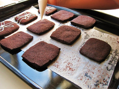 4.Pişen kurabiyeleriniz soğuduktan sonra üzerine beyaz jöle ile kurdela şekli verebilirsiniz veya sizin gözünüze nasıl hoş görünecekse o şekilde süsleyebilirsiniz.Eğer beyaz jöleniz yok ise beyaz çikolatayı benmari usulü eritip aynı şekilde uygulayabilirsiniz.